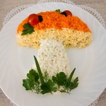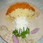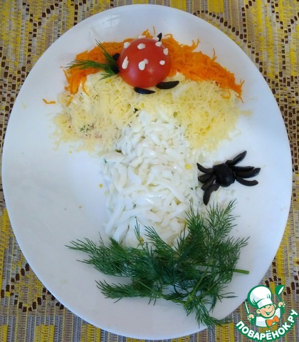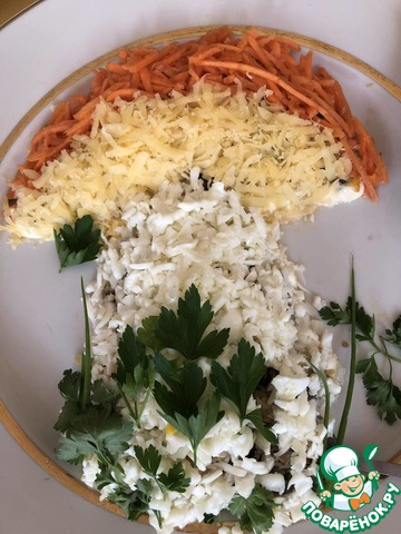 Я делала этот салатик, очень празднично смотрится на столе. Все гости оценили. Только я шляпку украшала не вареной морковкой, а морковкой по-корейски (тоже сама делала).