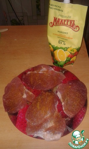 • Хорошо отбиваем, солим, добавляем любимую приправу и смазываем майонезом "Махеевъ" (2 ст. л.)