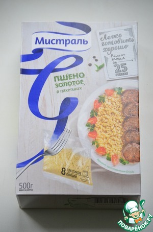 Пшено отварить до готовности по инструкции. Время приготовления 25 минут. Очень вкусное пшено в удобных варочных пакетиках и рассчитанная идеальная порция на одного человека.
