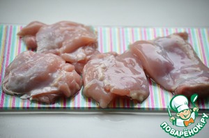 С окорочков (можно использовать филе грудки) удалить кожу, затем разрезать на две -три пластины, завернуть в пищевую пленку и хорошо отбить