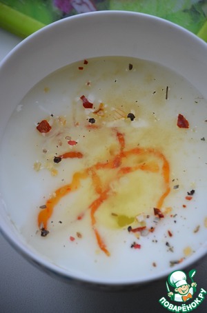 Смешать кефир, соус чили, сырой белок, добавить соль, приправу