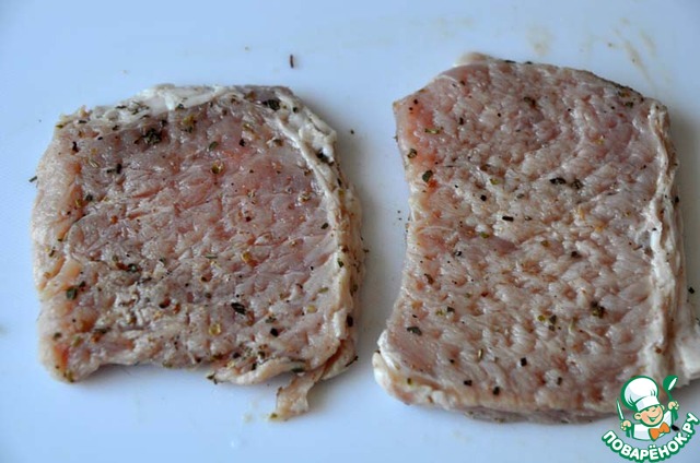 Мясо (у меня стейки из свинины) натираем солью, смесью перцев, кориандром и пряными травами. Заливаем бальзамическим уксусом и сухим белым вином.