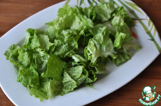 На сервировочное блюдо кладём "подложку" из порванных или нарезанных листьев салата.