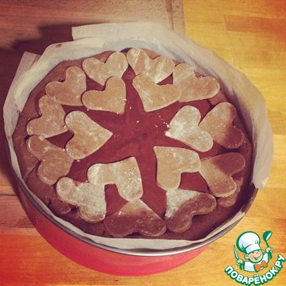 Выкладываем на тесто крем-мусс. А из оставшейся части теста украшаем пирог сверху так, как позволит вам ваша фантазия :) У меня вот так любвеобильно получилось... И ставим все это в разогретую до 180° духовку на 50-55 минут. Во время выпекания пирога запах во всей квартире стоит просто невероятный – так что приготовьтесь держать себя в руках!