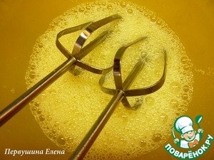 Взбить с холодной водой, коньяком, сахаром и солью в пену.