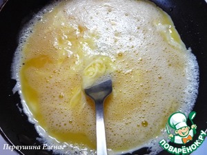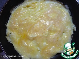 Раскалить сковороду, положить сливочное масло и вылить яичную смесь. Если сковорода маленькая, то хватит половины теста.