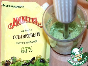 Теперь займемся кремом. В блендер кладем майонез, сыр, чеснок, перец, соль, базилик (петрушку), сливочный сыр. Все перемешиваем в блендере до состояния густой пасты.