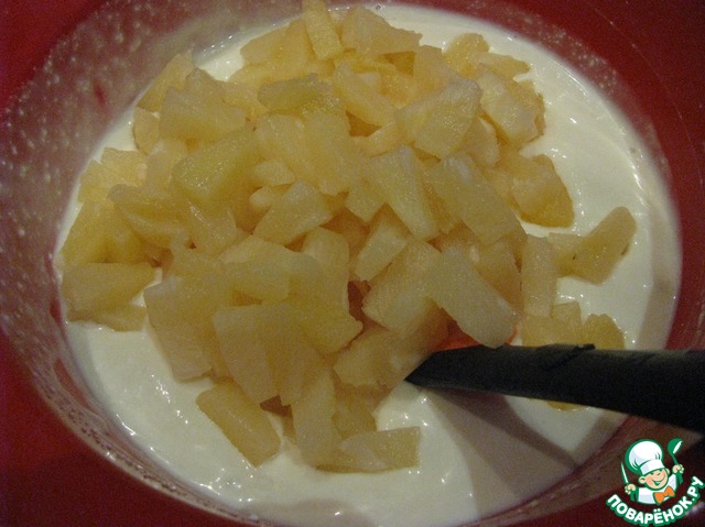 Теперь добавляем компот из фруктов (у меня ананасы), только без сиропа.