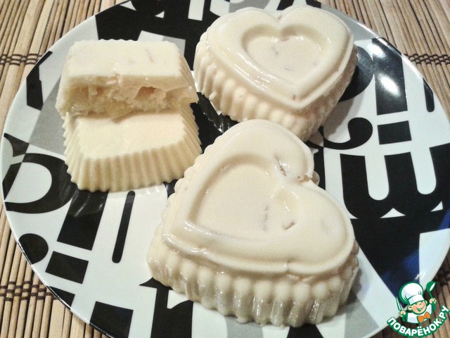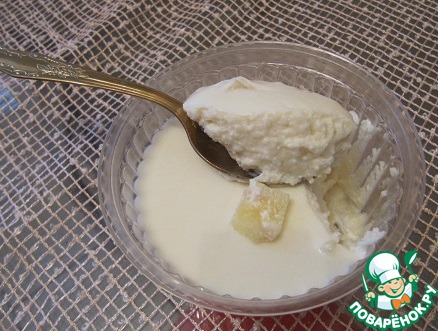После набухания желатина, довести его до горячего состояния, т. е. до полного растворения и процедить через мелкое сито. Добавить готовый желатин в творожно-сгущенную массу и перемешать.