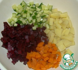 Нарезаем все небольшими кубиками: морковь, свеклу, картофель и свежий огурец.