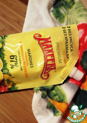 Салат раскладываем в порционные салатники и сверху поливаем майонезом Махеевъ и украшаем зелеными оливками с зеленью.