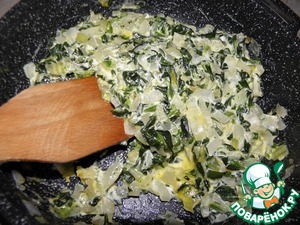 Пока готовится тесто, делаем начинку..: Лук мелко нарезать, обжарить на сковородке с растительным маслом, когда он подрумянится, добавить нарезанный шпинат, посолить, поперчить по вкусу., далее влить сливки, и когда они немного загустеют, добавить сырое яйцо, и все перемешать.