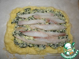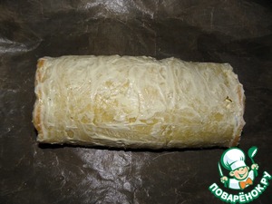 Сверху выложить рыбу, и при помощи пергамента, свернуть в рулет.
