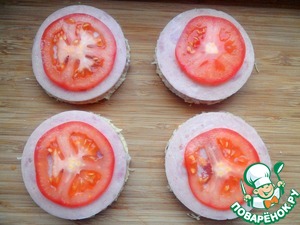 На них - кружочки ветчины. Далее - помидор и сыр.