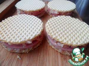 Изумительная альтернатива жареным котлетам - жаренный в вафлях куриный фарш, с прослойками сыра, помидора и ветчины. Получается довольно интересное блюдо и небанальная подача. Самое главное - готовится быстро, а результат потрясающий.
