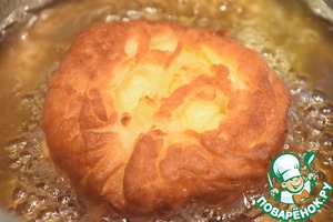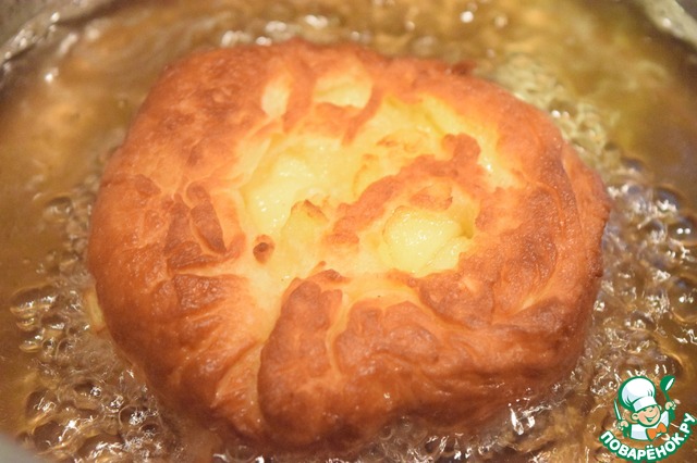 В кастрюле с толстым дном, разогреваем жир и жарим наши пончики с двух сторон до румяной корочки.