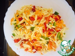 Сыр и морковь натереть на терке, положить в глубокую миску. Порезать помидор и паприку и добавить туда же. Посолить одной чайной ложкой соли и перемешать.