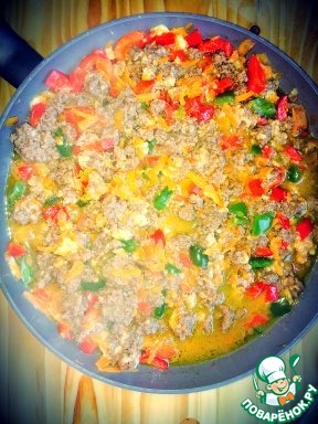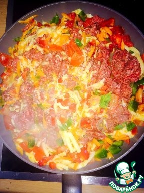 Разогреть сковородку, высыпать на нее овощи с сыром, посолить фарш и добавить его к овощам.