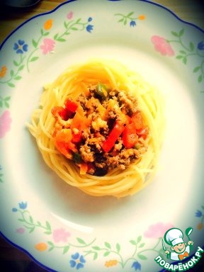 Рецепт «Гнездo из макарон с фаршем и овощами»: