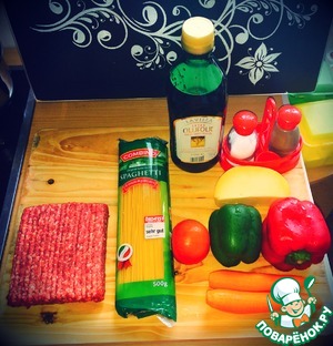 Ингредиенты для «Гнездo из макарон с фаршем и овощами»: