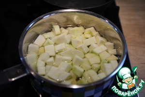 Картофель и кабачок нарезать небольшими кубиками и выложить в кастрюлю. Овощи залить водой и варить до мягкости (10-15 минут)