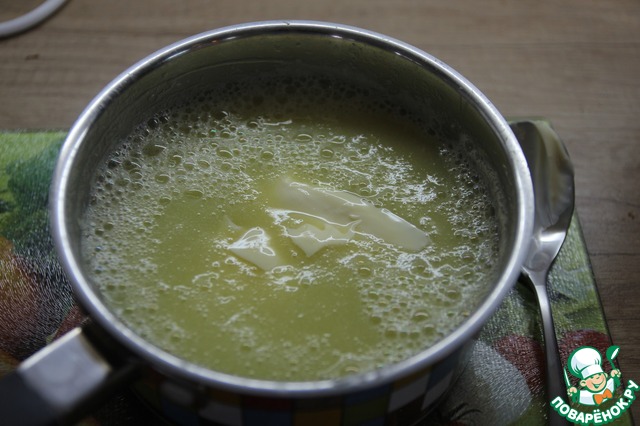 Готовый суп взбить блендером и добавить плавленный сыр. Хорошо перемешать до растворения сыра. Посолить, поперчить, влить сливки и подержать на огне в течение 5 минут.