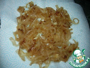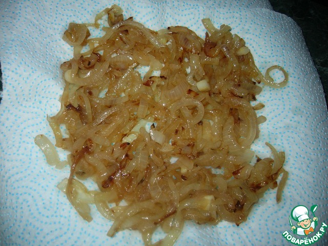 Лук нарезать полукольцами и обжарить до золотистого цвета. Готовый лук выложить на бумажное полотенце, чтобы стекло масло после жарки
