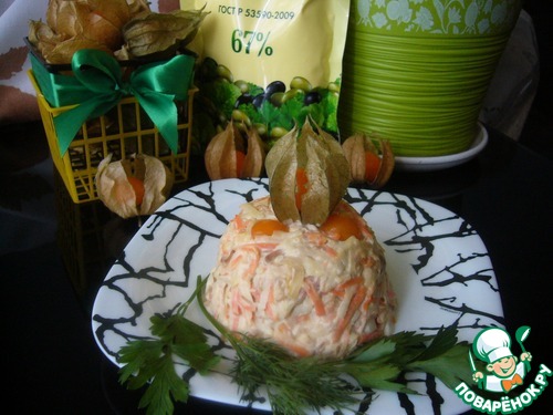 Сытный салат с овощами и мясом, заправленный майонезом, рецепт которого появился в моей кулинарной тетрадке в 80-е годы. С тех пор он стал одним их самых любимых салатов на нашем столе и каждый раз, осенью, когда в магазинах появляются чёрная редька и физалис я с большим удовольствием готовлю его для нас. Попробуйте и Вы его приготовить