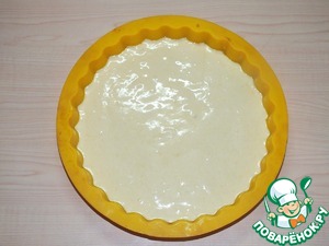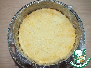 Формируем торт. В разъемное кольцо выкладываем бисквитный корж (я выстелила еще пищевой пленкой). По желанию пропитываем его сиропом (сироп можно взять любой на ваше усмотрение).