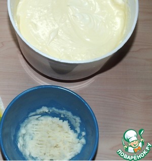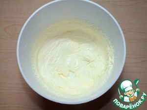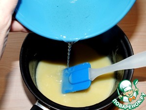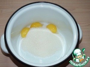 Желтки соединить с сахаром (100 гр) и молоком (25 мл), поставить на маленький огонь, проварить до не большого загустения