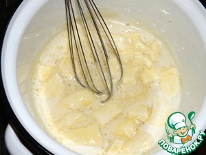 Добавить поломанный на кусочки белый шоколад (100 гр), размешать до растворения шоколада, снять с огня. Немного остудить и добавить сливочное масло комнатной температуры
