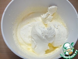 Соединить творожную массу и кремовую. 1 пакетик желатина залить небольшим количеством воды. Дать набухнуть. Растопить в микроволновке (10-20 секунд) и вылить в творожную массу.