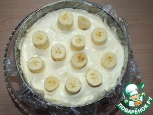 Затем выкладываем половину крема, выкладываем банан (порезанный на столбики)