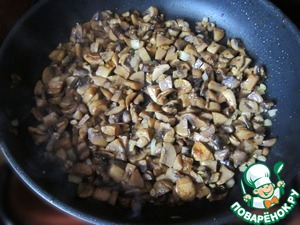Шампиньоны мелко порезать, обжарить вместе с мелко порезанным репчатым луком на растительном масле, посолить, поперчить, в конце за 1-2 минуты добавить 2 зубчика чеснока, пропущенного через чеснокодавку. После обжиривания смешать с обжаренным куриным филе.