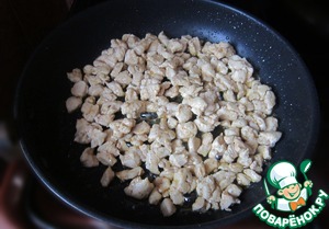 Куриное филе мелко порезать, обжарить на растительном масле без запах до легкого зарумянивания, добавив специи по вкусу: соль, перец, паприку.