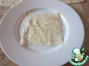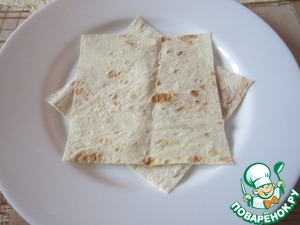Лаваш нарезать на равные кусочки, размером 10х10 см. На 1 корзиночку надо 2 кусочка лаваша. Я делал 12 порций. Итог: 24 квадрата.