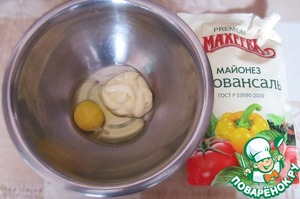 Готовим заливку: на 4 формочки понадобится 50 гр. майонеза и 1 яйцо, на 12 формочек следовательно 150 гр. майонеза и 3 яйца.