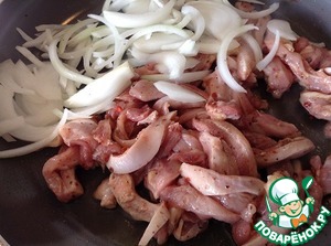 На оливковом (растительном) масле обжариваем курицу и нарезанную полукольцами луковицу в течение минут 7-10, до готовности курицы. Если будете использовать куриную грудку, сократите время до 5 минут. -