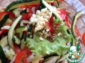 Берем полиэтиленовый пакет, складываем в него огурцы, болгарский перец и нашинкованную белую часть пекинской капусты. Солим по вкусу (маленькая щепотка соли) и чуть-чуть сахара ( на кончике ножа).