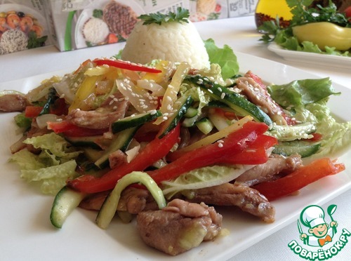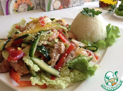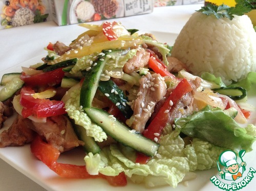 Быстрый, сочный, легкий и вкусный теплый салат. По мотивам Тайской кухни. Готовится легко, подходит и для семейного обеда-ужина, и гостей порадовать можно.