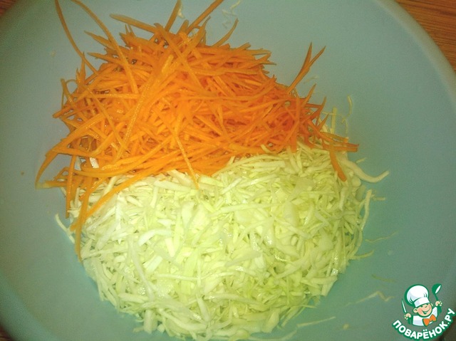 Морковку трем на терке для корейской моркови. Капусту с морковкой солим, перчим и перетираем руками, слегка мнем.