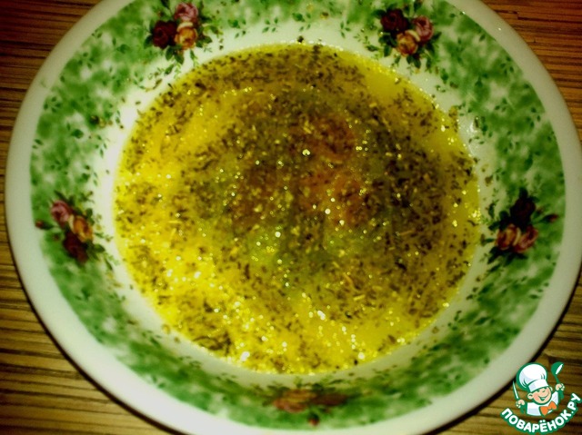 К оливковому маслу добавляем сок 1/3 лимона, 1/2 апельсина, итальянские травки и перемешиваем.