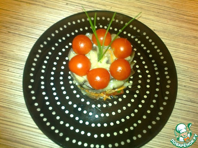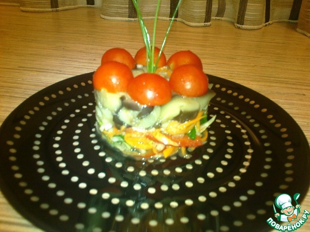 С помощью формовочного кольца выкладываем капустную смесь овощей, а потом баклажан. Украшаем помидорами черри и шнитт луком.