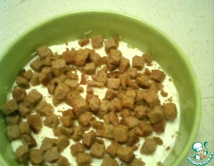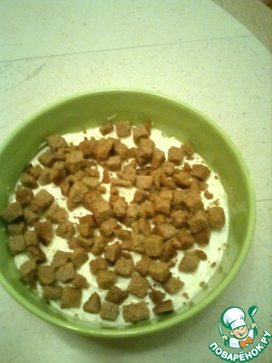 Выкладываем слоями, каждый слой промазываем майонезом, сверху посыпаем сухариками. Дать постоять, чтоб все слои пропитались, и можно подавать к столу! Приятного аппетита! :-)