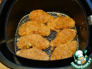 Разогреть мультипечь (или д/ш) до 180 градусов, кусочки грудки обвалять в муке, затем в яйце, затем в сухарях - выложить на решетку и смазать маслом слегка;