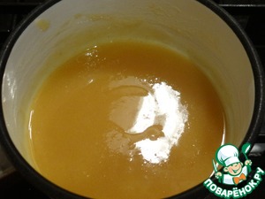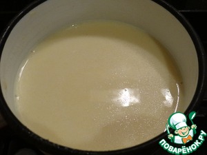 Тонкой струйкой влить молоко - мешать, не допуская образования комков - проварить до легкого загустения;