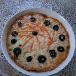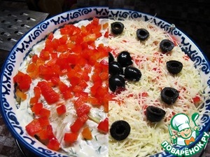 Верх посыпаем рубленой паприкой и тертым сыром. Можно украсить маслинами.