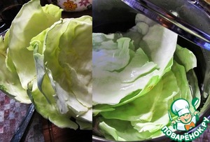 Капусту вымыть, разобрать на листья. Если при этом они повредятся, это не страшно. В фарш добавить соль и специи по вкусу. поставить на огонь кастрюлю с водой, добавить соль, довести до кипения. Убавить огонь, положить капусту и проварить около 8 минут. Вынуть листья шумовкой и положить в дуршлаг, чтобы стекла вода.