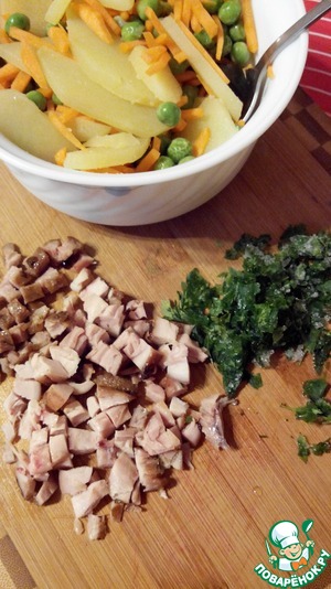 Добавить мелко нарезанное мясо (у меня запеченная курочка, подойдет говядина) и рубленную зелень