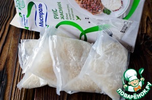 Для этого рецепта нам понадобится 4 пакетика риса Жасмин от ТМ Мистраль. Опустить пакетики в кипящую воду и варить до готовности.